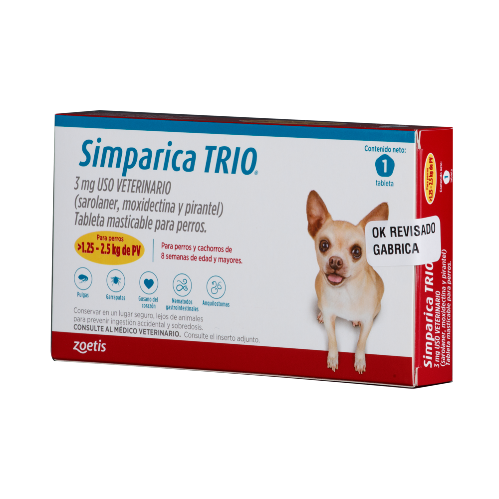 superiores a $000.000Simparica Trio Dorado indicado para perros pequeños entre 1.25 y 2.5 kg. Previene pulgas, garrapatas y parásitos intestinales en una sola tableta.