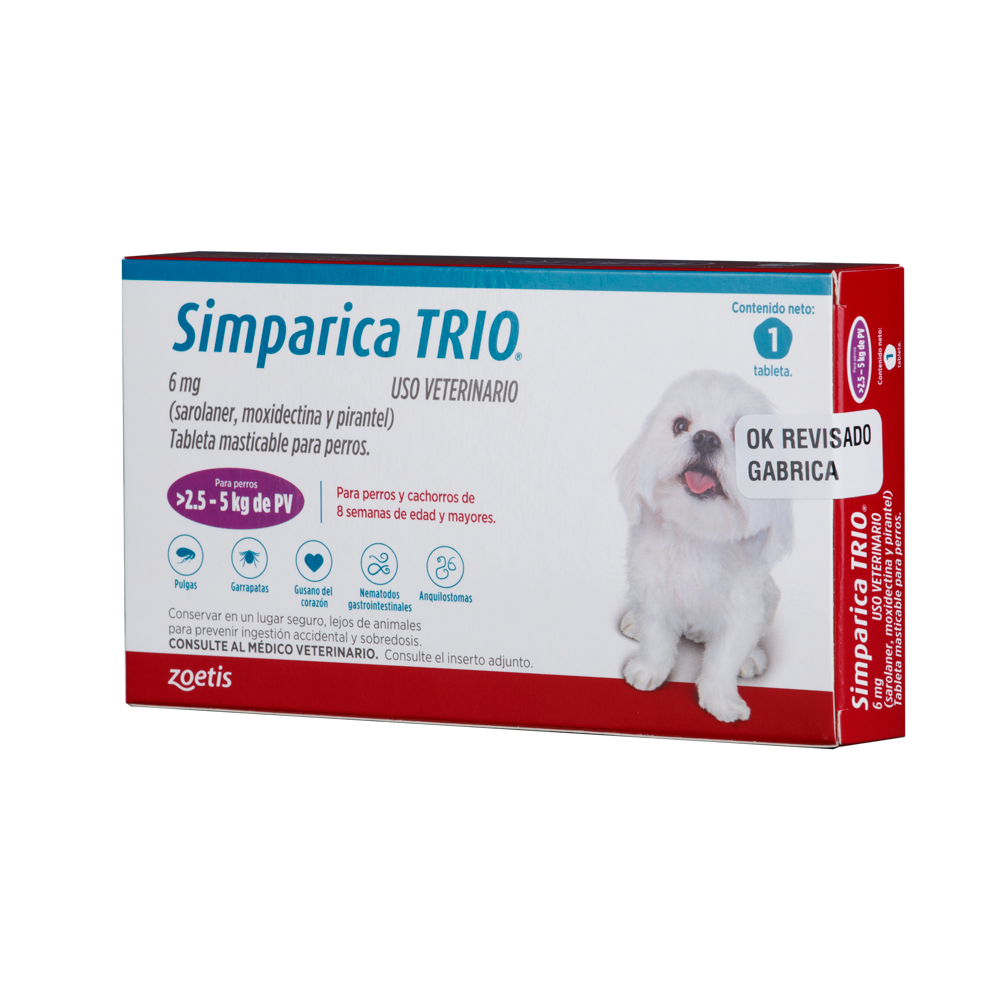superiores a $000.000Antiparasitario Simparica Trio Morado para perros entre 2.6 y 5 kg. Triple acción contra parásitos externos e internos en una sola dosis mensual.