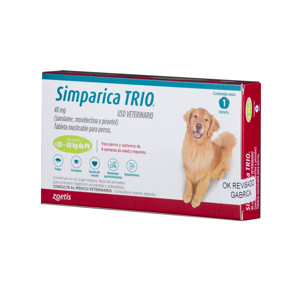 superiores a $000.000Simparica Trio Verde para perros grandes de 20 a 40 kg. Antiparasitario de amplio espectro con acción combinada contra parásitos internos y externos.