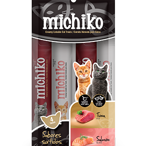 superiores a $000.000Pack de sobres húmedos para gato con sabor combinado a atún y salmón. Marca Michiko. Contiene 4 unidades.